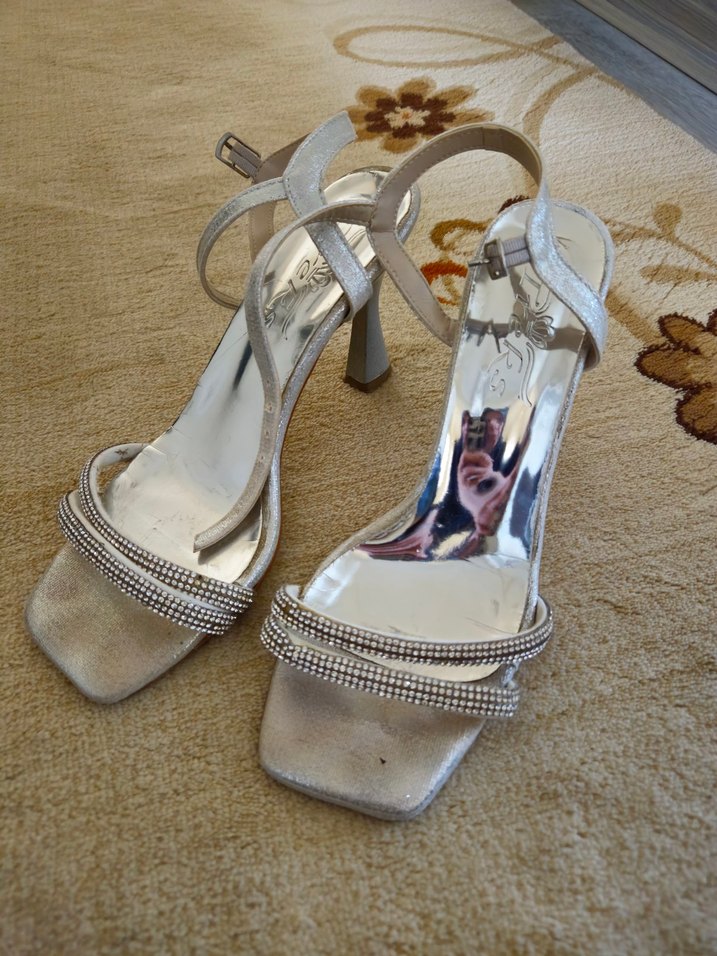 Parlak gümüş rengi ışıl ışıl görünümlü tokalı klasik ve şık topuklu ayakkabı sorunsuzdur