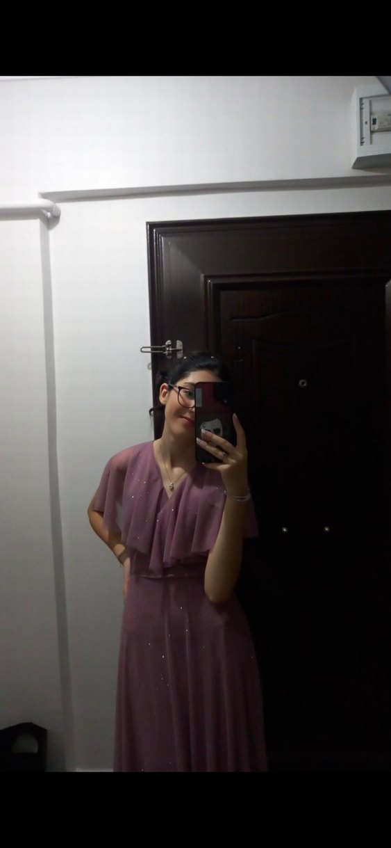 Pudra pembesi, şeffaf detaylı, straplez yaka ve kısa kollu, ince ve ipeksi kumaştan yapılmış, sade ve şık uzun elbise.