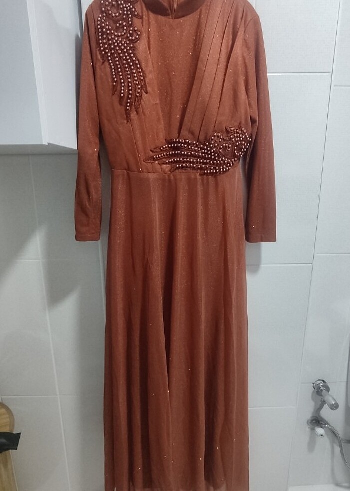 Ürün 2 kez giyildi, kuru temizleme yapıldı, simli kumaştır. Kiremit rengidir.