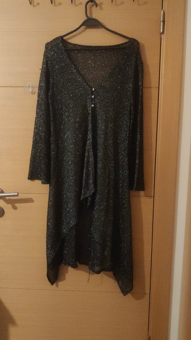 Siyah, uzun kollu, drapeli ve bol kesim abiye elbise, V yaka detayıyla gece partileri için uygundur. Hafif ışıltılı kumaşı dikkat çeker. ✨