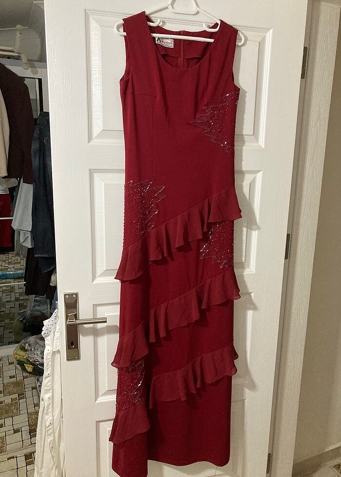 Ürün likralı o yüzden çok rahattır çok az giyildi bordo renk asla boncuklarında düşme yoktur kusursuz elbise boyu 152 cm