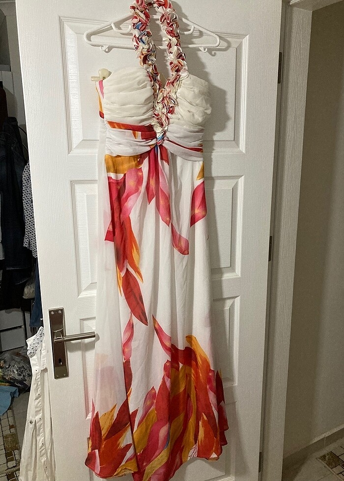 Tam yazlık straplez boyundan bağlamalı şifondan 34 / 36 bedene uygundur