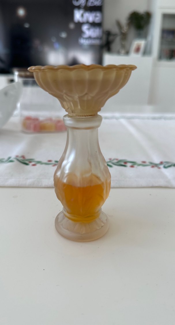 Bu vintage kadın parfüm şişesi, kabartmalı kapak ve amber renkli parfüm içeren mat cam tasarıma sahiptir. Üst kısmı fotoğrafta göründüğü gibi. Kutusuz