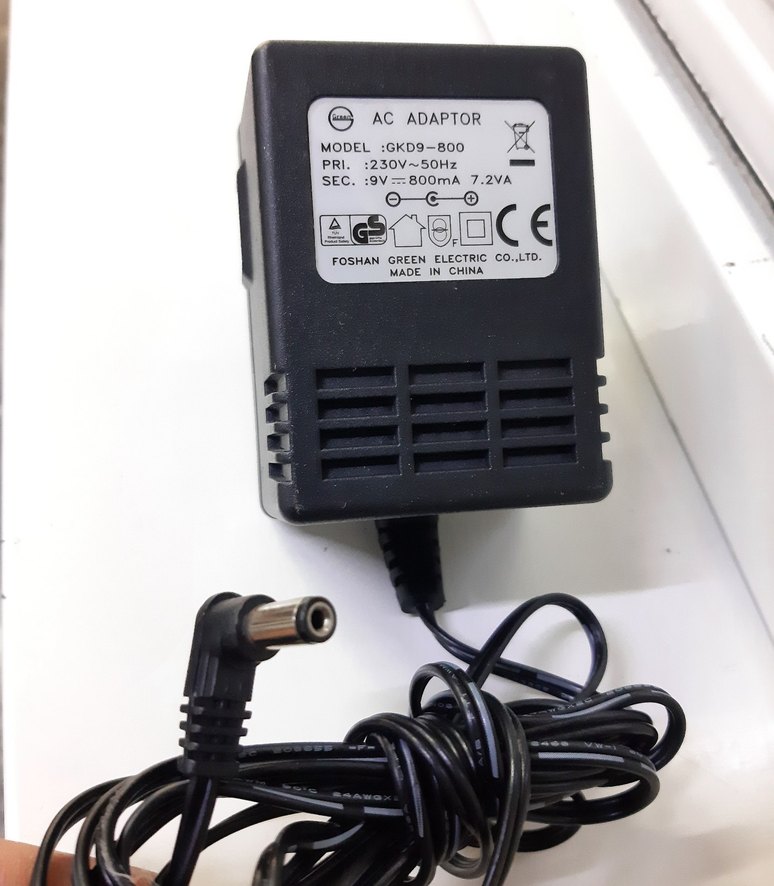 Gri AC adaptör, 9V 800mA çıkış ve 230V 50Hz girişe sahip. Model GKD9-800, Çin'de Foshan Green Electric tarafından üretilmiştir. 7.2VA güç gerektiren cihazlar için uygundur. ⚡
