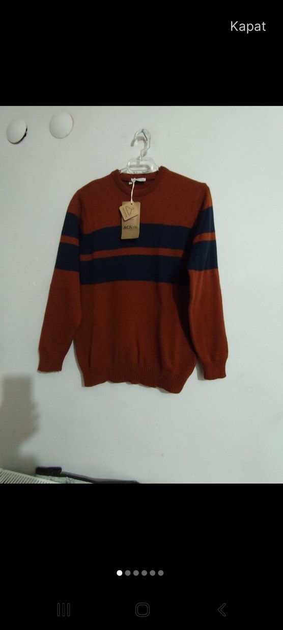 Örgü yapısında, kahverengi ve lacivert çizgili, yuvarlak yaka ve uzun kollu erkek kazak. Yün malzemeden, rahat kesim ve günlük kullanım için uygun. Sıfır Ürün..
