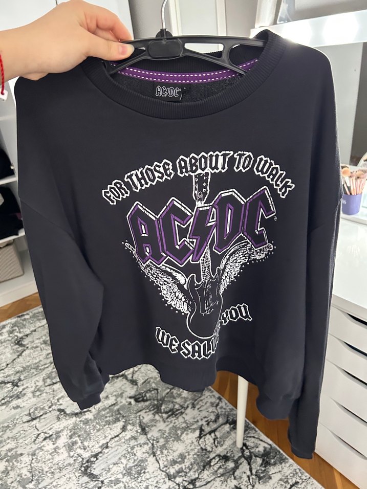 Pamuk kumaştan, uzun kollu ve yuvarlak yakalı, bol kesim mor-siyah sweatshirt. Üzerinde AC/DC baskısı bulunan grunge punk tarzı.