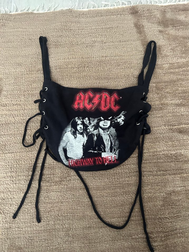 Siyah deri, sıkı kesim, askılı ve yanları bağcıklı AC/DC baskılı rock punk penye korse.