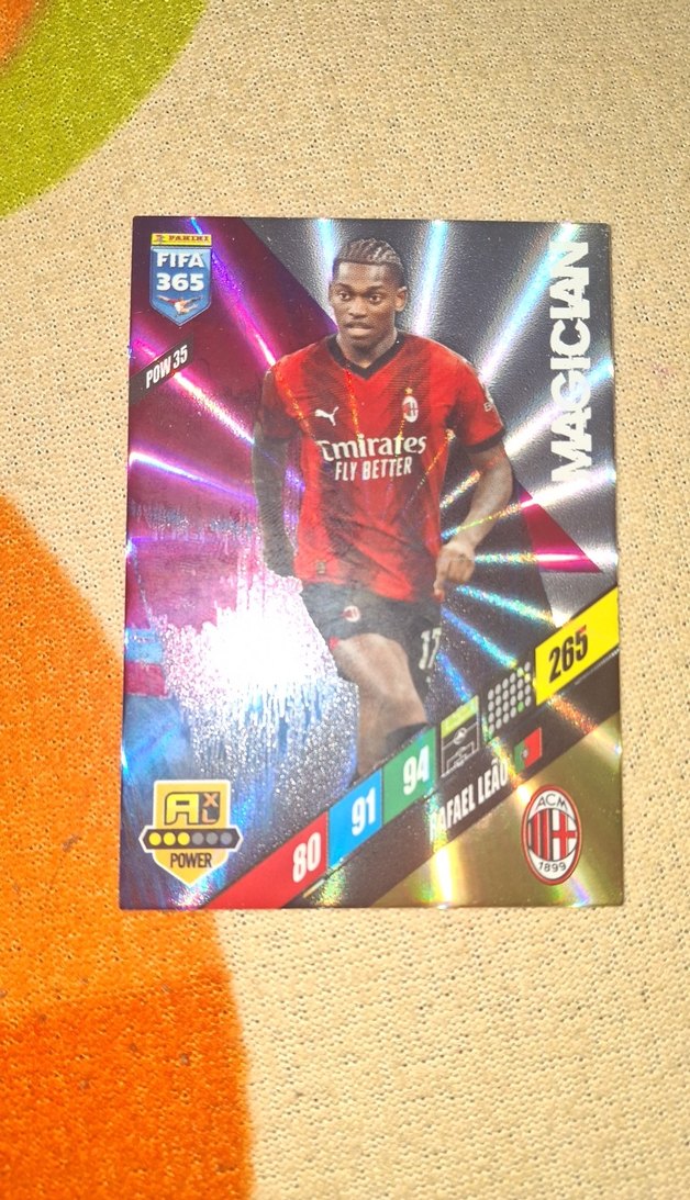 Canlı renklerde AC Milan futbol rozeti, kırmızı formayla oyuncu resmi, FIFA 365 ve Emirates Fly Better logoları içerir. Güç ve yetenek puanları gösterilir. ⚽