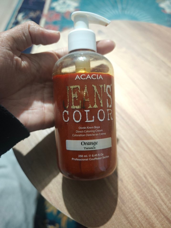 Acacia Jeans Color turuncu saç boyası, 250 ml pompalı krem formda, canlı renk ve kolay uygulama sağlar.