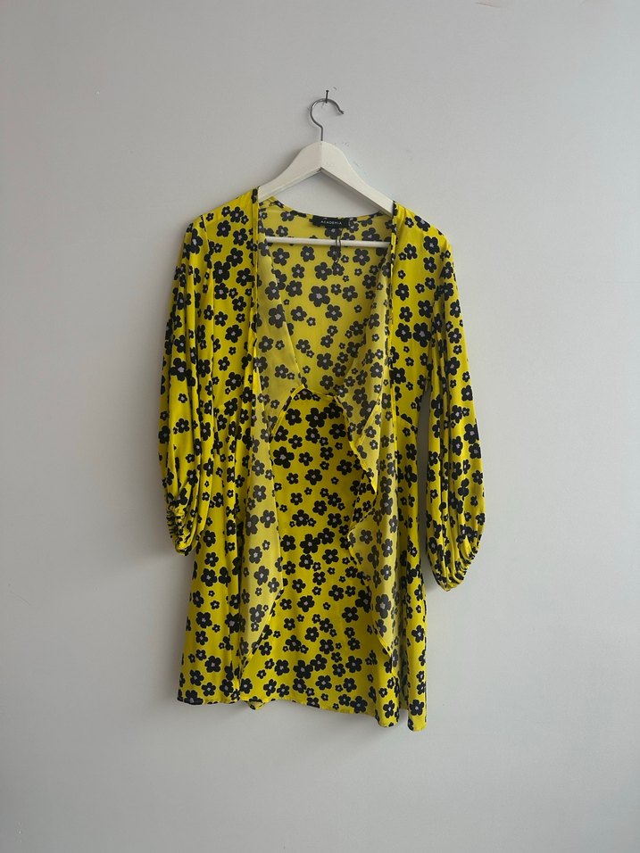Academia marka Sarı Çiçek Desenli önü dekolteli mini elbise