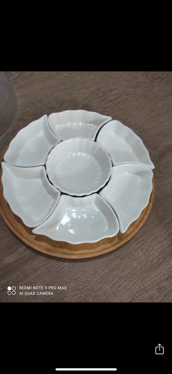 Beyaz bohem tarzda, ahşap tabanlı servis tabağı seti. Aperatif veya atıştırmalıklar için uygundur. ️