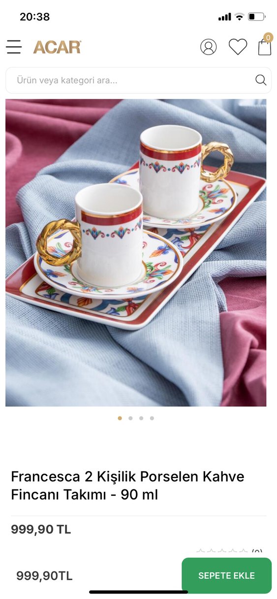 Acar Francesca 2 kişilik porselen kahve fincan takımı, renkli desenli tabaklar ve altın renkli kulplar içerir. Yanında servis tepsisi bulunur. sıfır etiketli ve paketlidir