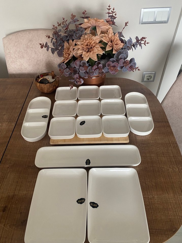 Acar porselen orta sunum grubu,yeni ve etiketli,ürün videosunu izleyebilirsiniz,dikdörtgen ahşap 360 derece dönerlidir