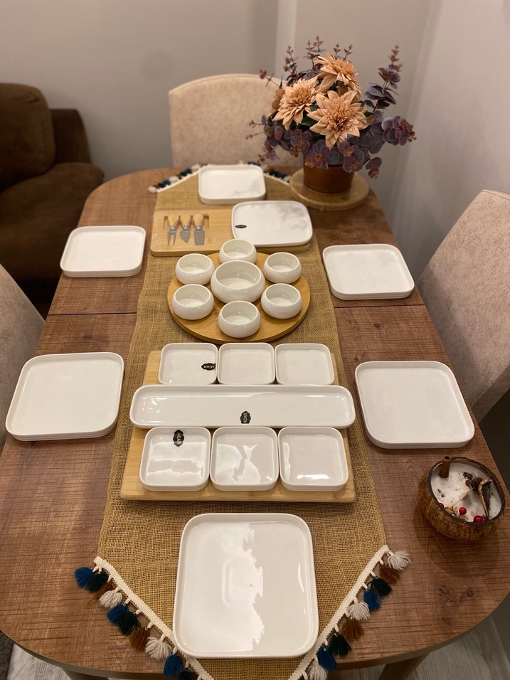 Acar porselen 6 kişilik(servis tabağı fazla isteyene fiyat farkı ile ekleme yapılır),yeni ve etiketli çok şık,masada görüldüğü şekilde ve sayıdadır,hem yuvarlak ahşap hem de dikdörtgen ahşap 360 derece dönerlidir,ürün videosunu izleyebilirsiniz