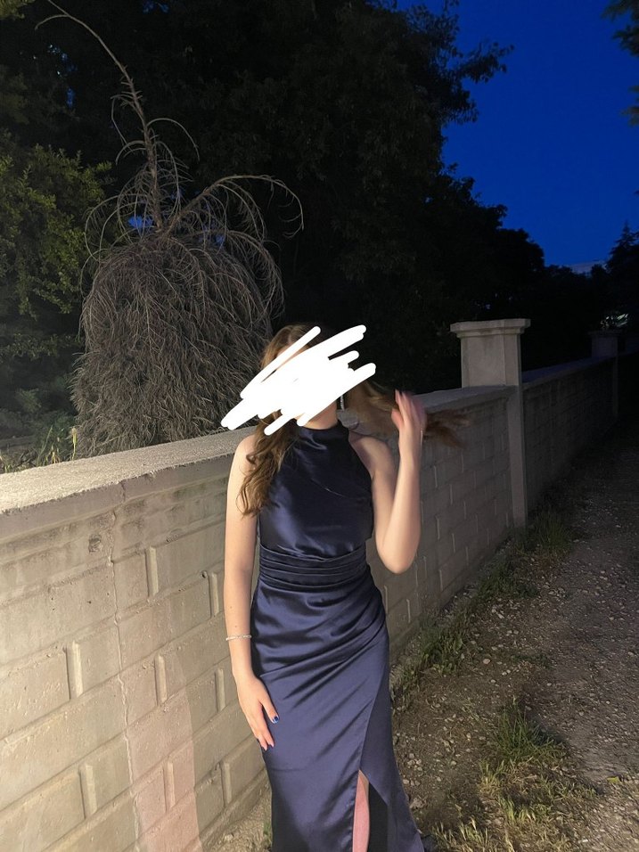 Accort saten lacivert gece elbisesi.