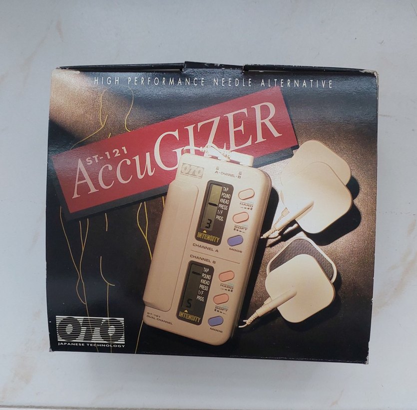 Dual Channel OTO Bodycare AccuGIZER ST-121 Çift Kanallı Elektroterapi Kas Stimülatörü Orijinal AccuGizer ST-121 masaj cihazı. İğnesiz akupunktur / TENS etkisiyle kas gevşetme ve rahatlama sağlar. Çift kanal (Dual Channel) Farklı masaj modları (tap, pound, knead, press vb.) Ayarlanabilir yoğunluk seviyesi Evde, ofiste pratik kullanım Pedleriyle birlikte gönderilecektir Kutulu halde gönderilecektir. Hic kullanılmamıştır.