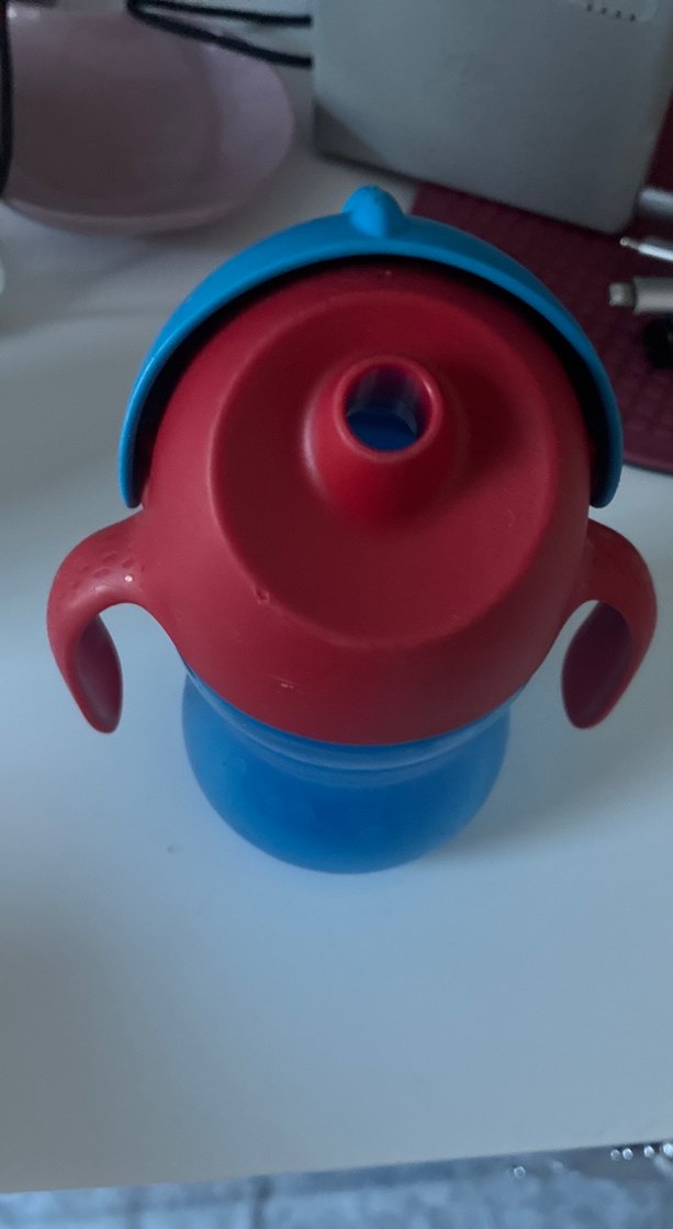 Mavi gövdeli ve kırmızı renkli bebek biberonu, tutması kolay kulplar ve koruyucu kapak içerir.