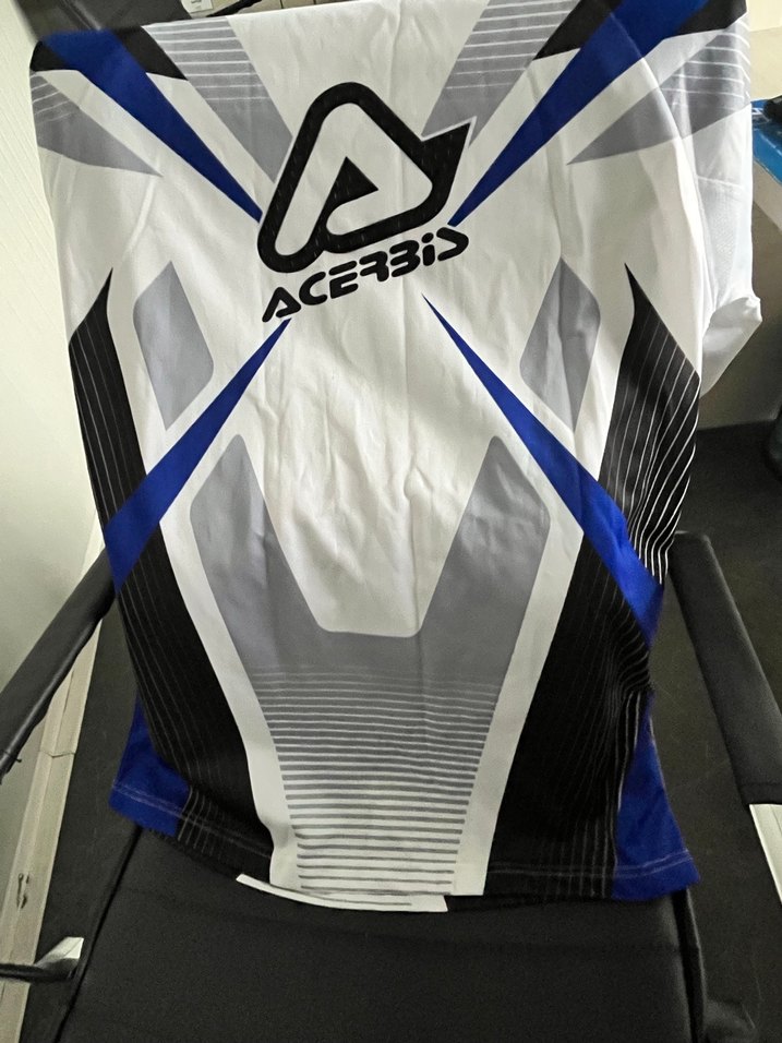 Mavi ve gri renklerde, sentetik kumaştan yapılmış, kısa kollu, bisikletçi tarzı, vücuda oturan erkek forması. Velcro detaylı, üzerinde ACERBIS markası bulunur. L bedendir.