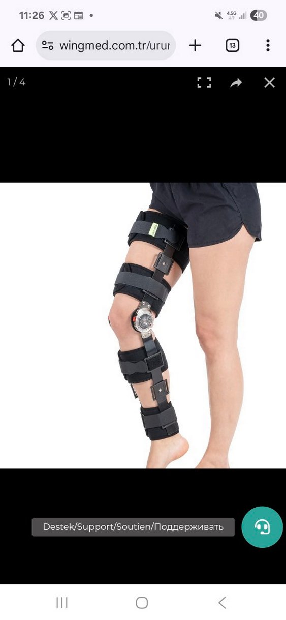 W515(Uzun) W515(Uzun) Açı Ayarlı Dizlik (Uzun) Anatomik bacak şekline uygun olarak tasarlanmış alüminyum bar ve cilde temas eden yüzeyleri havlu kumas olan derece ayarlı diz ortezidir. Fleksiyon (0°, 15°, 30°, 45°, 60°, 75°, 90°, 105°, 120°) ve ekstansiyon (-15°, 0°, 15°, 30°, 45°, 60°, 75°, 90°) derece ayarı yapılır. Diz yaralanmaları sonrası mükemmel bir stabilizasyon ve destek sunar. Ameliyat ve travma sonrası rehabilitasyon döneminde koruyucu olarak kullanılır ve dizin R.O.M. kontrolünü sağlar. Kısa ve uzun olarak 2 boyu vardır. Endikasyonları Bağ yaralanmalarında ameliyat sonrası kontrollü ve dereceli eklem mobilizasyon Menisküs yaralanmalarinda ameliyat sonrası Cerrahi operasyon sonrası istenilen açıda hareketsiz istirahatte Diz rekurvatum hasarlarında Stabil femür kırıkları