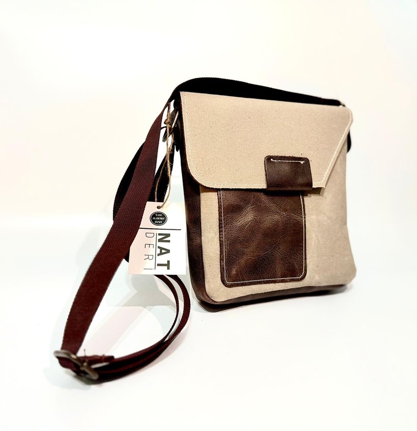 Acı kahve & Bej Hakiki Deri & kanvas Kumaş Unisex Omuz Çantası