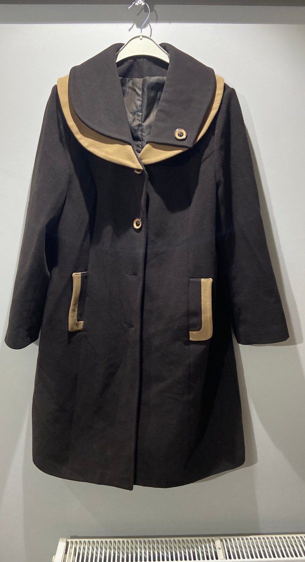Acı kahve renkte, camel detaylı büyük yakalı ve düğmeli kadın kaban. Önünde cep detayları bulunur, şık ve sıcak tutar. 2 adet düğmesi eksik.