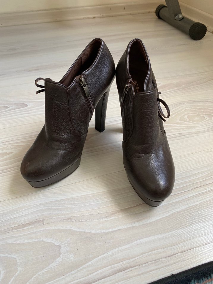 Kahverengi deri kadın botlar, platform topuklu ve tokalı detaylıdır. Kolay giyim için fermuarlar bulunur. Minimalist ve çağdaş tarz, ofis kullanımı için uygun. Hakiki deridir.