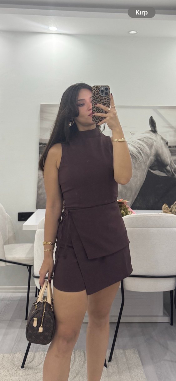 Kahverengi, yüksek yakalı ve kolsuz mini elbise, ipeksi kumaştan kemer detaylı ve vücuda oturan şık bir model. Romantik akşamlar için uygun.