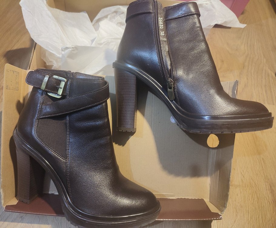 Koyu kahverengi hakiki deri kadın botları, kalın topuklu ve tokalı, yan fermuarlı. İçi kürklüdür. 10 cm topuklu. Trendy casual ve iş stili için uygun. Az kullanılmıştır. Temiz ürün. Tokasında küçük çizikler mevcuttur.