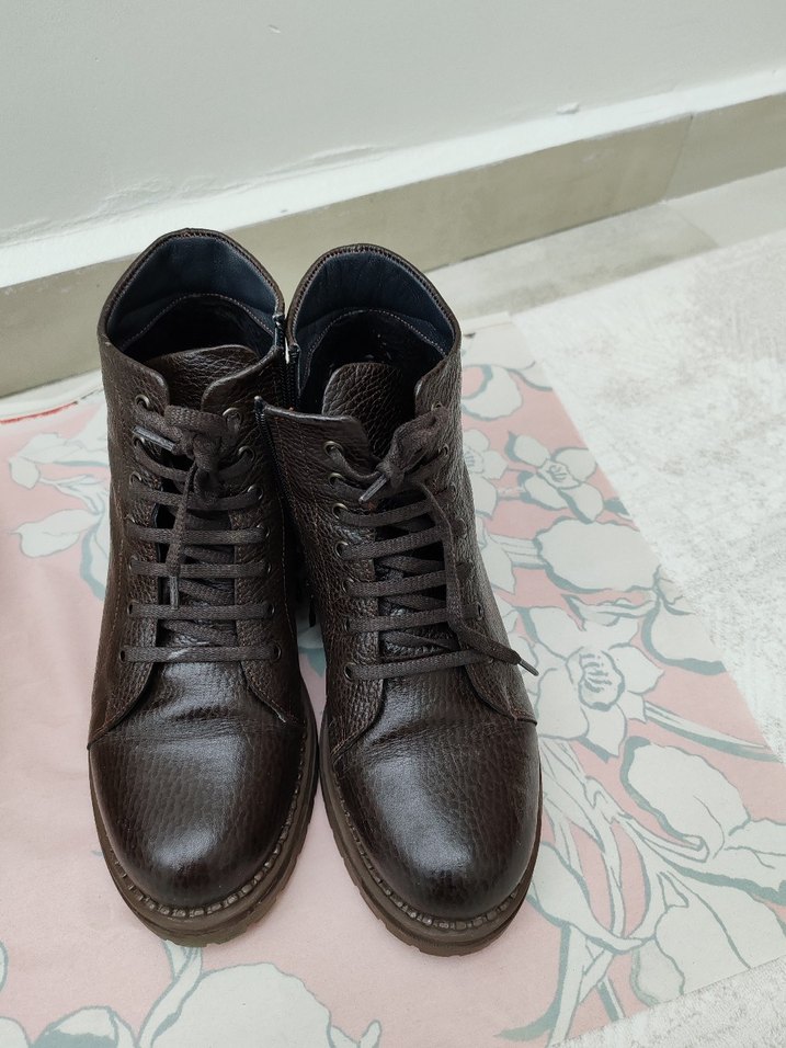 Acı kahverengi tokalı bot, sokak tarzında.İçi polar dır. Temiz ürün Bir kaç kez giyildi.Deridir.