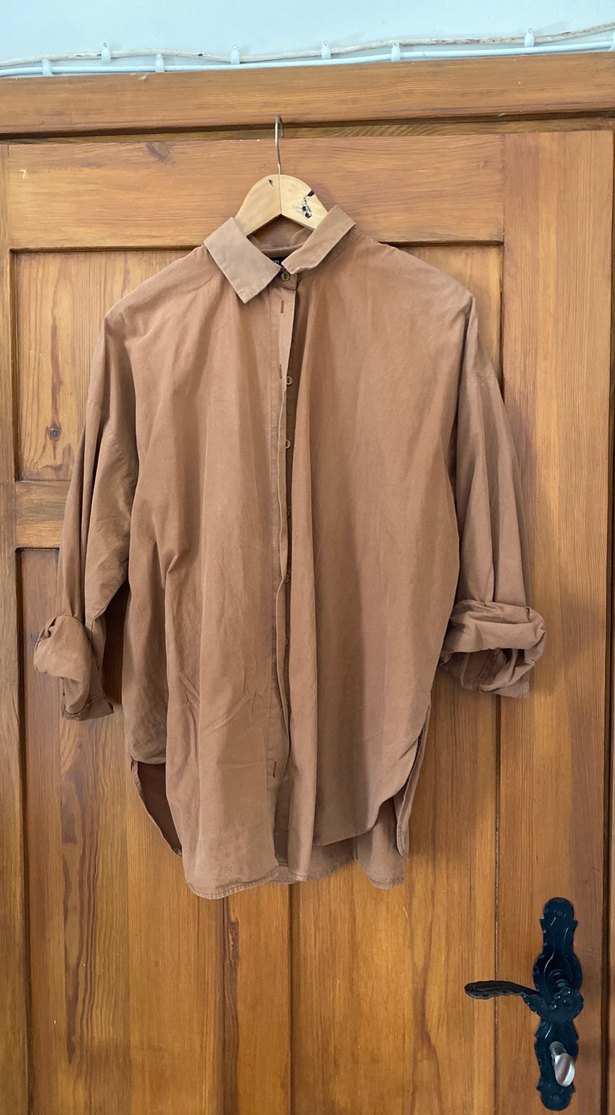 Aci kahve kumaştan, düğmeli, uzun kollu ve midi boyda, rahat kesim kadın gömleği. Günlük sokak tarzı için uygun.