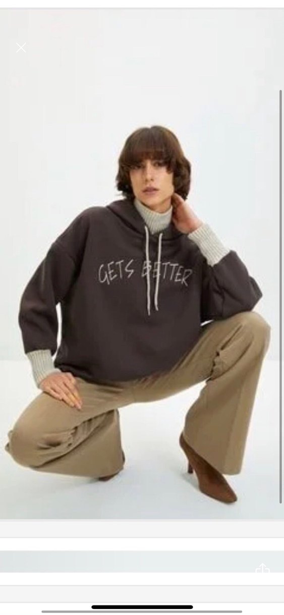 Dik yakalı, uzun kollu, bol kesim kadın sweatshirtü. Gri örgü manşetleri. acı kahve hic kullanilmadi boğazlı sweatchirt
