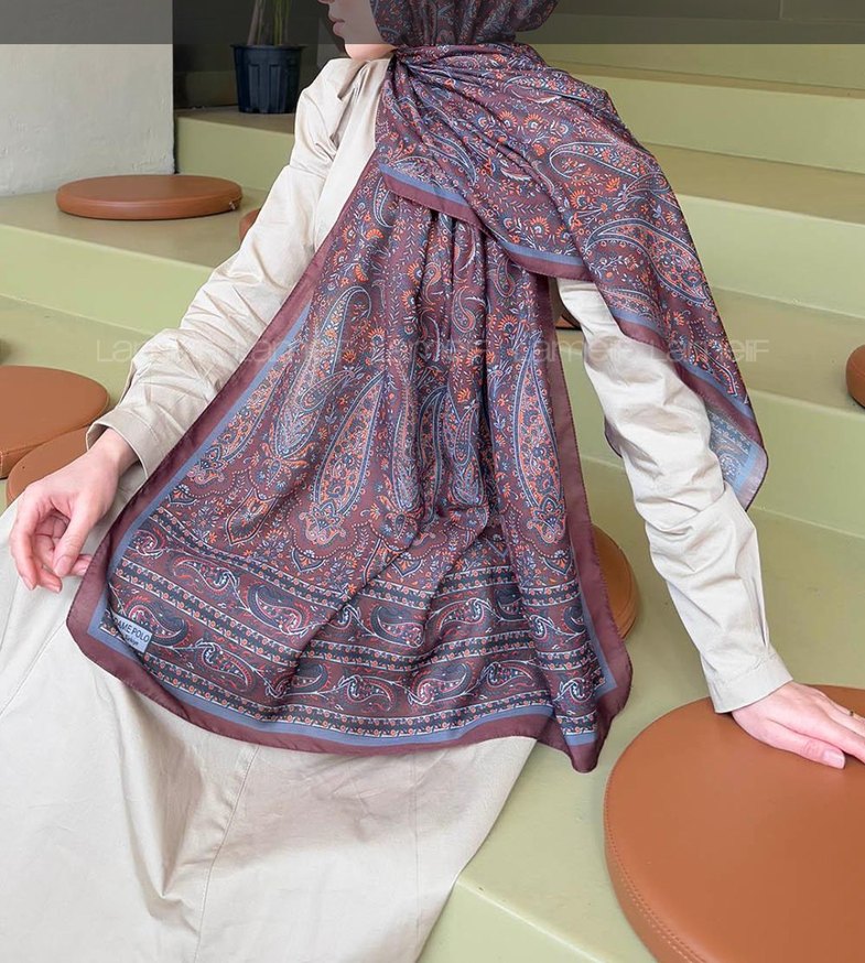 acı kahve renkte, dökümlü tasarıma sahip kadın şalı. Yumuşak sentetik kumaş üzerinde koyu bohem desenler bulunur. Retro ve hippie stiller için uygun. denedim sadece kullanmadım iğne izi minik var