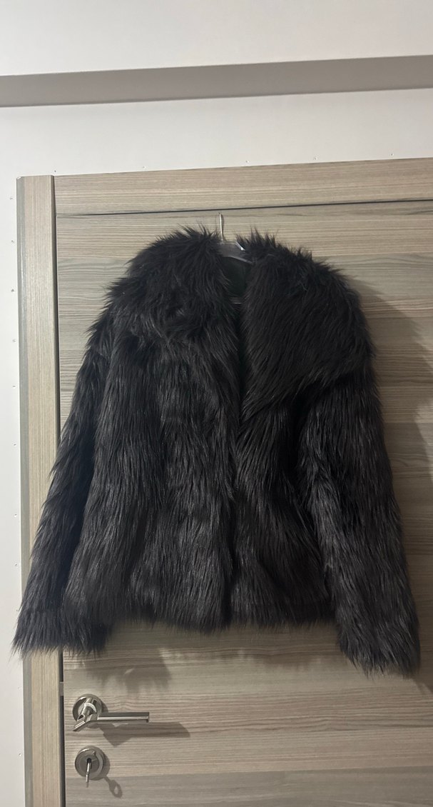 Kahverengi, suni kürkten yapılmış, yakalı ve uzun kollu, orta boy uzunlukta, şal yaka içi astarlı rahat ve desen içermeyen kadın ceket. Butikten alındı şık duran bir kaban sıcak tutar M-L uyumludur