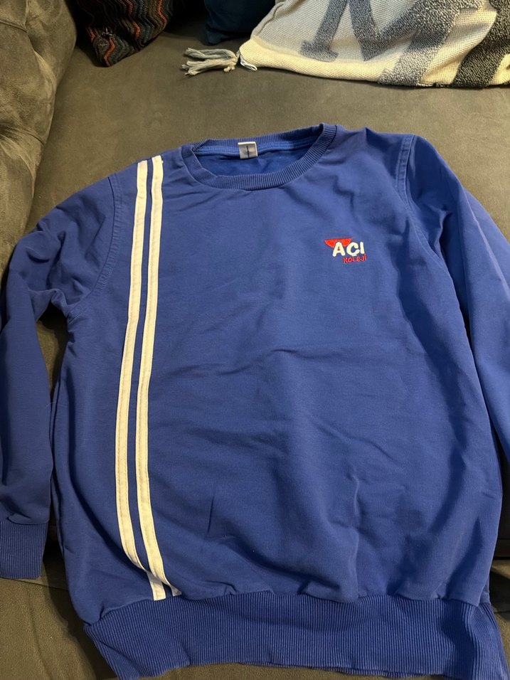 10-11 yaş Mavi, uzun kollu, bisiklet yaka, baskılı ve fermuarlı detaylı, spor ve günlük kullanıma uygun, parlak görünümlü fitted sweatshirt. Önde 'AC' yazısı bulunur.