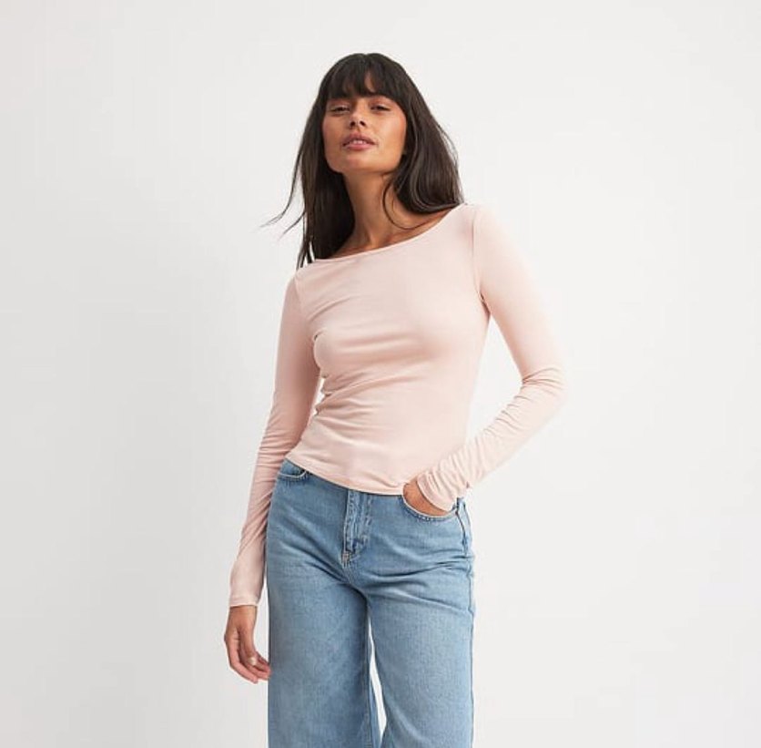 Açık pembe renkte, kayık yaka, uzun kollu ve tek renk kadın bluz, tekne yakalı ve rahat kesimiyle günlük kullanıma uygundur. Yumuşak denim kumaştan üretilmiştir.