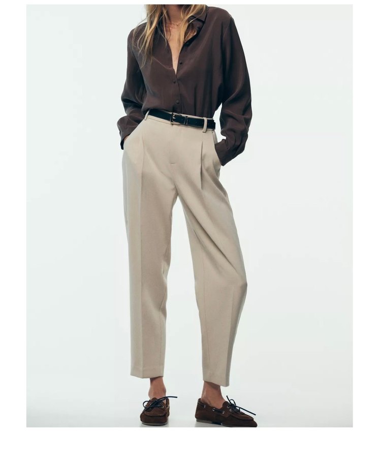 Açık Bej renkli, diz boyu kadın kumaş pantolon, rahat kesim ve ipeksi dokusuyla ofis için uygun. Desensiz, normcore tarzıyla zahmetsiz şıklık sunar. Kemerli 1 kere giyildi