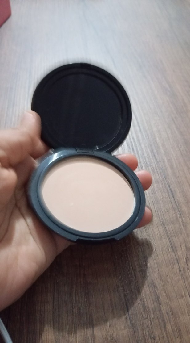 Doğal bir görünüm için siyah kompakt kutuda açık bej pudra.