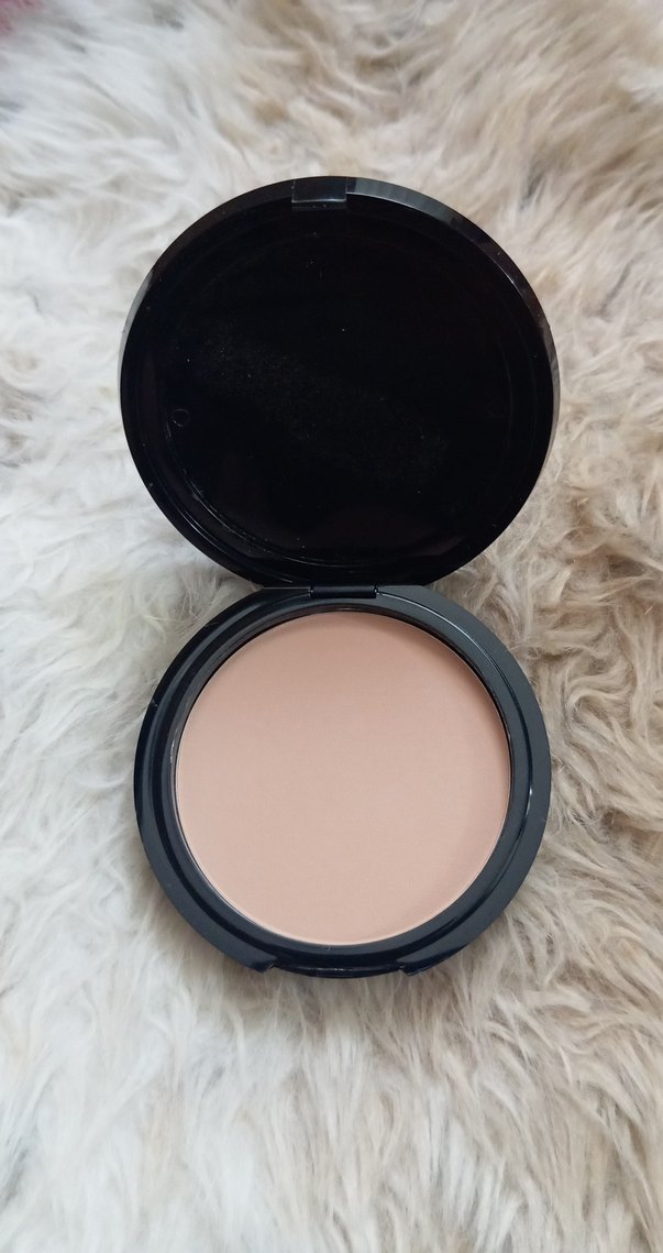 Siyah kompakt kutuda açık bej renkte pürüzsüz bitişli pudra.