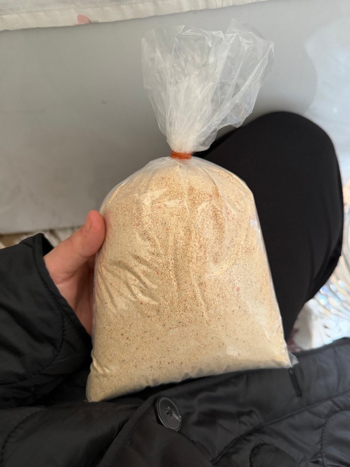 Çeşitli kullanımlar için uygun, şeffaf plastik poşette açık bej toz.