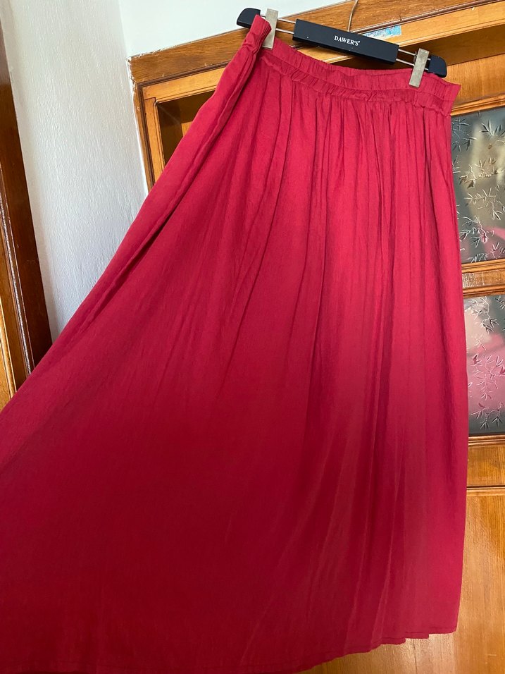 Bordo renkte, satenimsi dokuda, bol kesim ve drapeli uzun bohem etek, parlak görünümüyle romantik akşamlar için uygun.Bel lastiği biraz gevşek isterseniz ölçü bildiririm.
