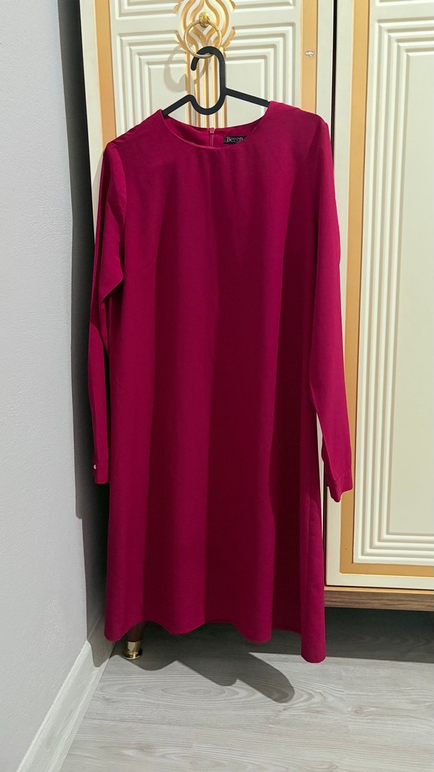 Bordo renkli, uzun kollu, salaş kesim yuvarlak yakalı, satenimsi kumaştan ofis tarzına uygun minimalist ve desensiz tunik.