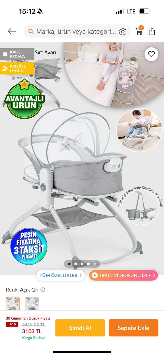 Açık gri renkli, yumuşak dokulu bebek beşiği ve sepeti. Sallanabilir özelliğe ve oyuncaklı çıtaya sahiptir. Bebekler için rahat ve çok yönlü dinlenme alanı sağlar. 4-5 aylık olana kadar bunu kullandık gece gündüz, taşınabiliyor olması çok işimize yaradı. Uyanıkken de eğimli şekilde kullandık. Her kademesi çok işe yarıyor. Artık oturmak istemediği için satıyorum. Eğimi ayarlama ve takip çıkarma yerinde biraz takılma yapıyor, zorlamak gerekiyor. Sadece o kusuru var o yüzden fiyatı uygun tutuyorum. kargo olmaz let go yada Ataşehir
