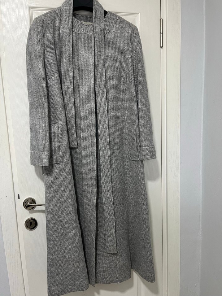 Yumuşak kumaştan yapılmış, kemerli ve ön cepli açık gri uzun kaban. Serin havalar için katmanlı kullanıma uygun.