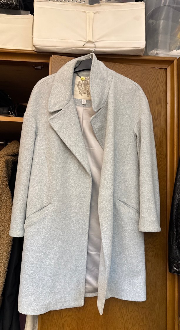 Yumuşak dokulu, açık gri renkte uzun kadın kabanıdır. Geniş yakası ve yan cepleri ile rahat ve şık bir kullanım sağlar.