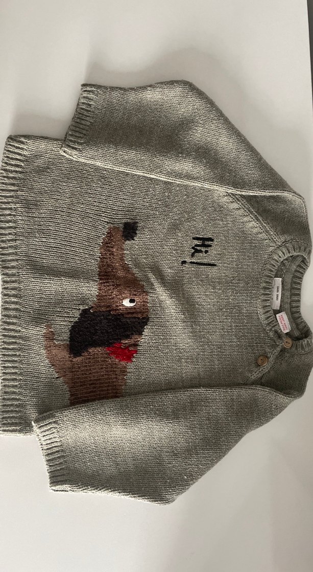 Açık haki renkli, uzun kollu ve bisiklet yaka örgü kız-erkek çocuk kazağıdır. Nakışlı köpek deseniyle rahat ve günlük bir tarz sunar.