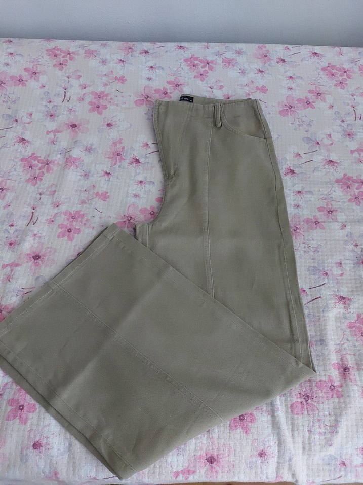 acik haki pamuk kumaştan, bol kesim ve midi boy kadın pantolon. Günlük kullanıma uygun, sade ve şık bir görünüm sunar.