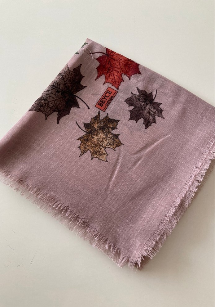 Çok açık sütlü kahve renkte, yaprak desenli ve hafif dokulu sentetik kumaştan yapılmış bohem tarzda bir eşarp