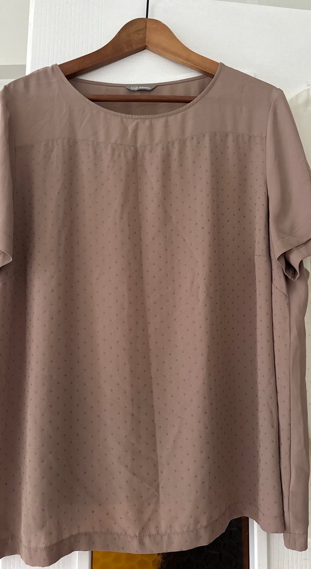 Kısa kollu, yuvarlak yakalı, sütlü kahve salaş bluz. Sentetik kumaştan taş baskı detaylı, minimalist ofis tarzına uygun.
