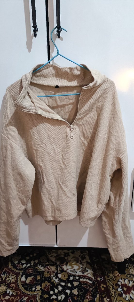 Açık kahve renkli keten kumaştan, yüksek yakalı ve uzun kollu kadın sweatshirt. Fermuarlı ve bol kesim, rahat sokak stili için uygun.