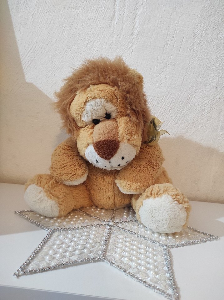 Yumuşak ve açık kahverengi, kabarık yelesi olan peluş aslan oyuncak. Kukla oyuncak